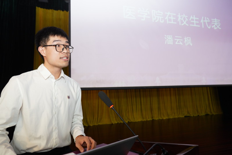 2024级博士研究生潘云枫作为在校生代表发言。他结合自身经历,鼓励学弟学妹要平衡好临床与科研两大任务,积极响应国家号召,为推进南大教育、科技、人才融合贡献力量。