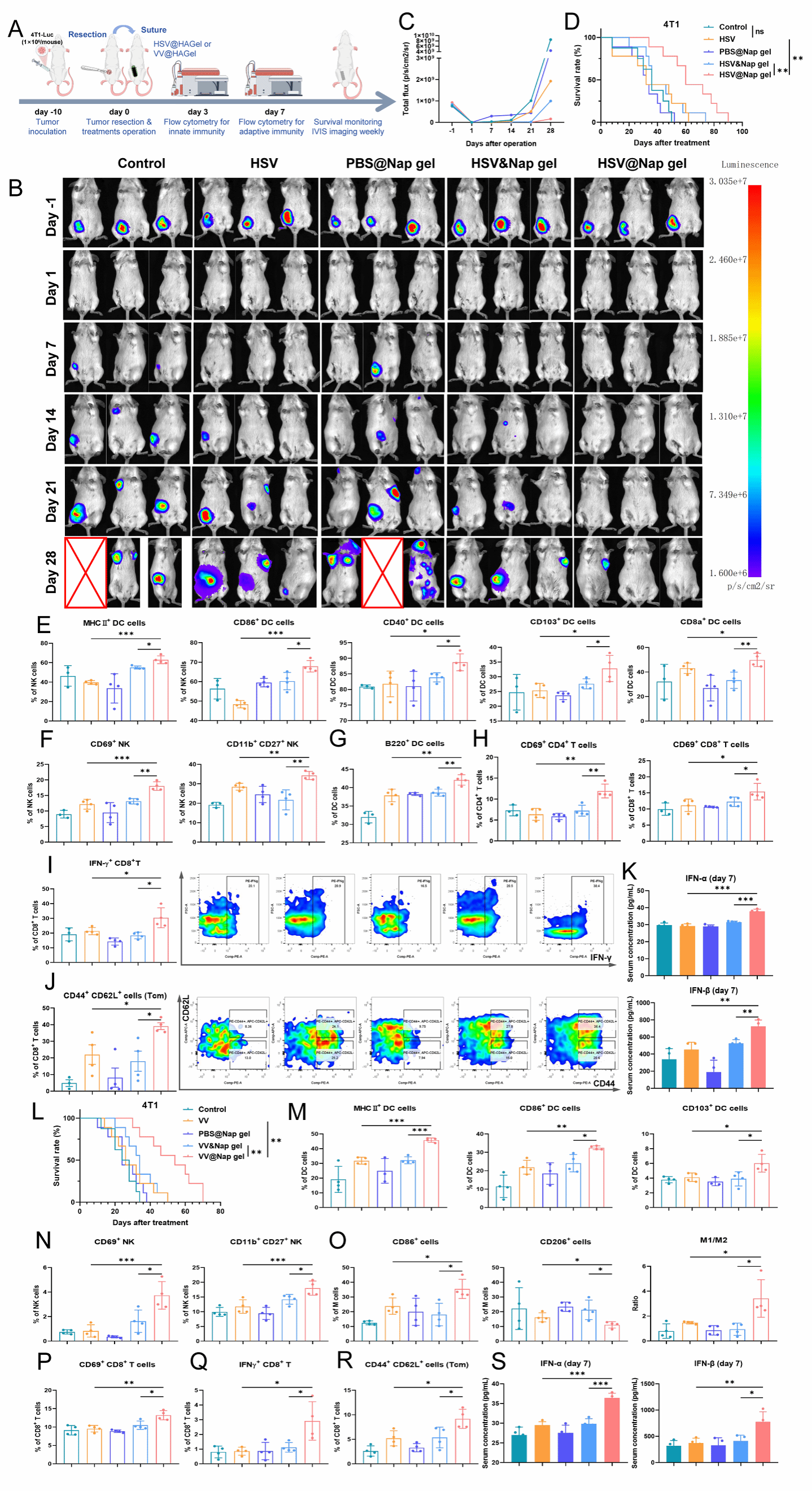 在最新的研究中,85po 吴俊华/江春平团队设计并实现了溶瘤病毒(腺病毒adv、单纯疱疹病毒HSV或痘苗病毒VV)始于术中的在手术原位的持续释放。在乳腺癌原位小鼠模型中,肿瘤切除后立即原位植入adv@Nap gel可以持续性激活抗肿瘤免疫,控制肿瘤术后复发。此外,他们还将这一概念扩展到包括其他类型的病毒载体(HSV和VV),并在人源化小鼠肿瘤模型中验证了相关 结果。这些发现为控制肿瘤术后复发方法的开发提供了重要的治疗策略和理论基础。