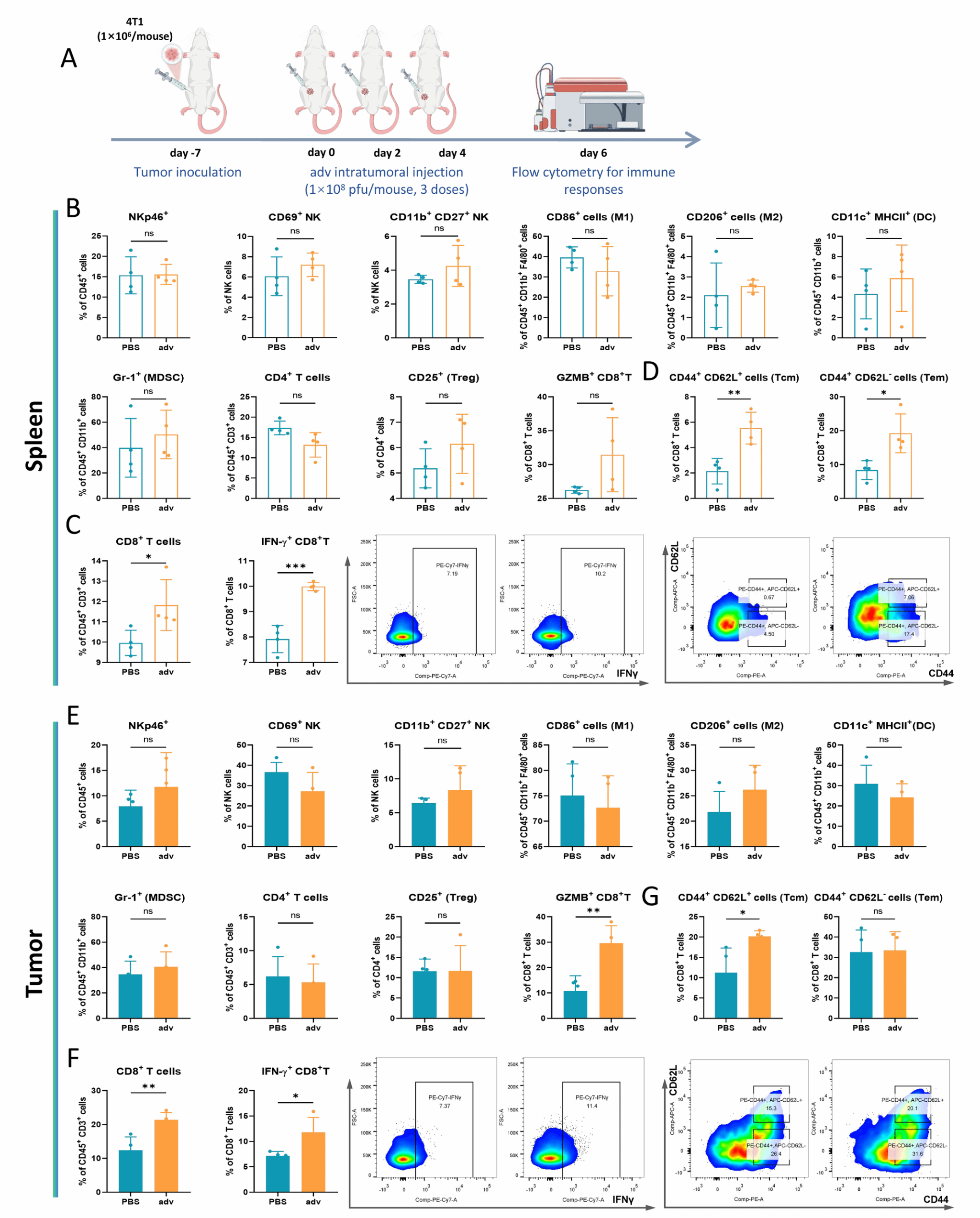 图1. 溶瘤腺病毒adv在原位乳腺癌模型中的抗肿瘤免疫调节作用。