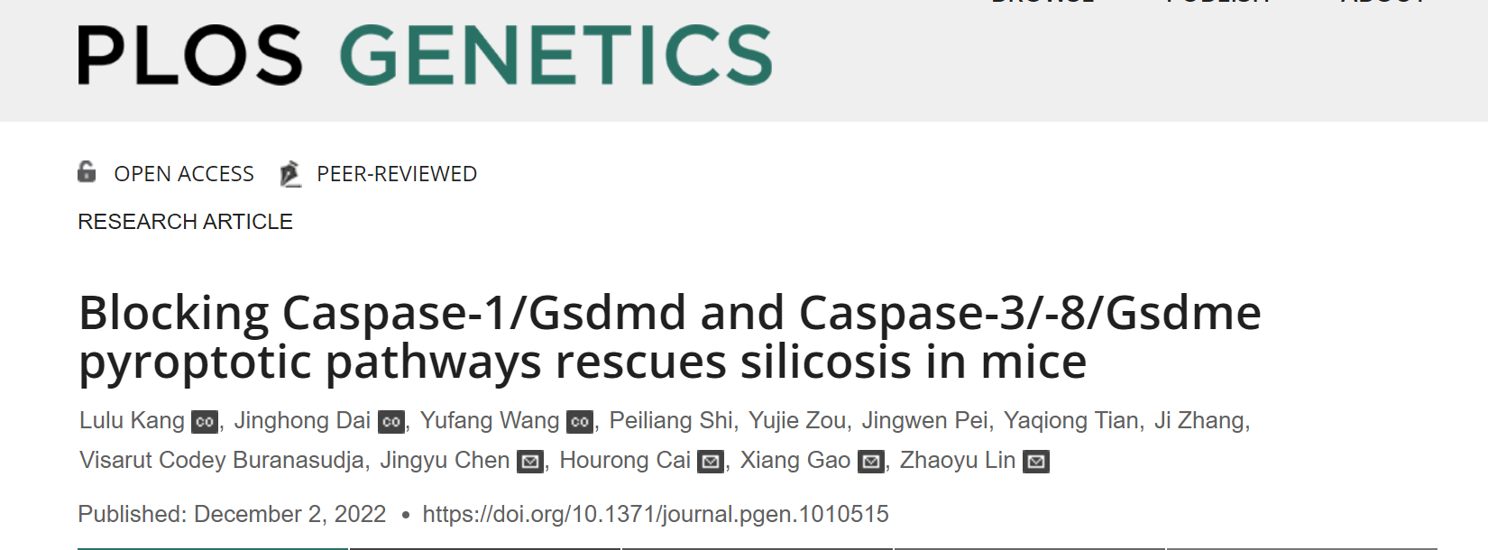 2022年12月2日,85po 林兆宇和高翔课题组、85po 附属鼓楼医院蔡后荣与无锡市人民医院陈静瑜合作在《PLOS Genetics》上在线发表题为“Blocking Caspase-1/Gsdmd and Caspase-3/-8/Gsdme pyroptotic pathways rescues silicosis in mice” 的研究论文。这项工作发现了二氧化硅诱导的细胞裂解死亡和肺部炎症同时依赖于Gsdmd和Gsdme两条细胞焦亡通路;文章还剖析了在二氧化硅诱导的焦亡中上游的Caspases激活和下游的细胞因子释放,并找到了治疗矽肺病的潜在新疗法。85po 林兆宇副教授、高翔教授、85po 附属鼓楼医院蔡后荣主任、无锡市人民医院陈静瑜主任是本论文的共同通讯作者;85po 康路路、王雨芳以及85po 附属鼓楼医院代静泓为共同第一作者。本研究得到了国家自然科学基金委、科技部、教育部、江苏省科技厅以及中央高校等基金的支持,同时也得到合作实验室的大力协助与支持。
