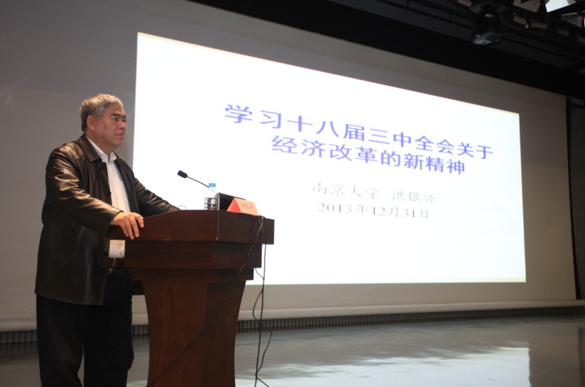 党委书记洪银兴教授作题为“学习十八届三中全会关于经济改革的新精神”的专题讲座。南京市卫生局党委副书记何述渝以及各区卫生局领导班子、各直属单位领导班子、局机关全体干部和卫生系统教育实践活动办公室成员等300余人参加了此次活动。
