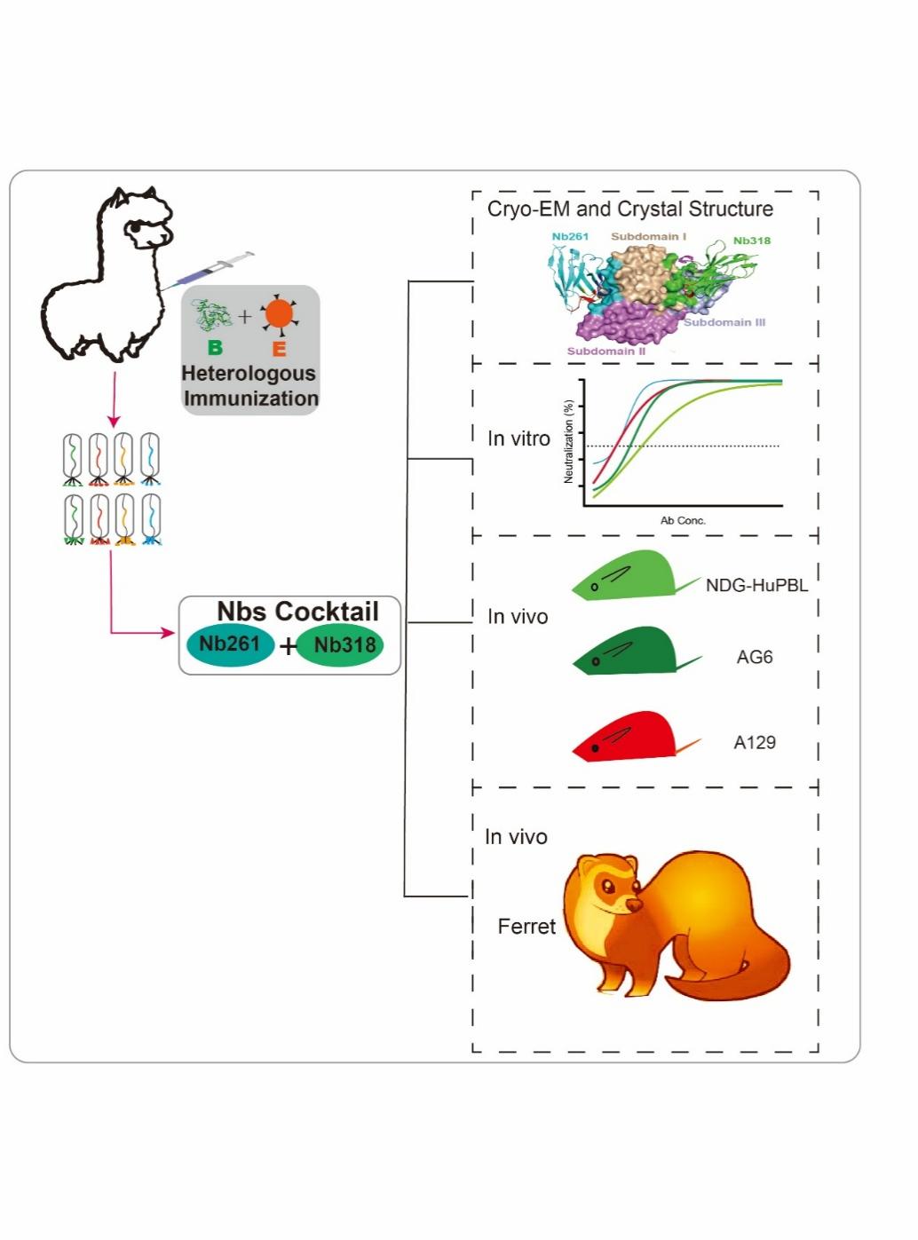 85po 吴喜林助理教授团队在长期研究基础上取得重要突破。团队历时 9年,基于此前研发的第一代纳米抗体(Wu et al., JCI Insight 2020)以及建立的SFTSV感染人源化小鼠模型(Xu et al., PLOS Pathogens 2021),通过序贯异源免疫策略,从不同亚型 SFTSV抗原免疫的羊驼中筛选获得了新一代高亲和力、广谱中和单域纳米抗体(包括 Nb71、Nb261、Nb317、Nb318)。结构生物学分析进一步揭示,Nb261和 Nb318分别靶向 SFTSV Gn蛋白上两个高度保守且互不重叠的关键表位,可协同阻断病毒入侵。基于此构建的纳米抗体“鸡尾酒”(Nb261+Nb318)在体外对多亚型 SFTSV实现完全中和,表现出显著的协同抗病毒活性。