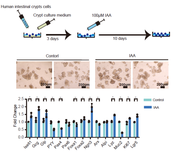 在使用IAA对TPN小鼠进行干预后,发现IAA可显著缓解此类小鼠的糖代谢障碍,同时其还影响调节机体糖代谢稳态重要因子GLP-1的表达。随后,该团队开展了小鼠及人体肠道类器官的实验,结果发现使用IAA刺激之后,类器官增殖相关基因(Ki-67),L细胞分化相关基因(Pax6,Foca1,Ngn3)及促进GLP-1分泌(Gcg) 等相关基因均表达上调。