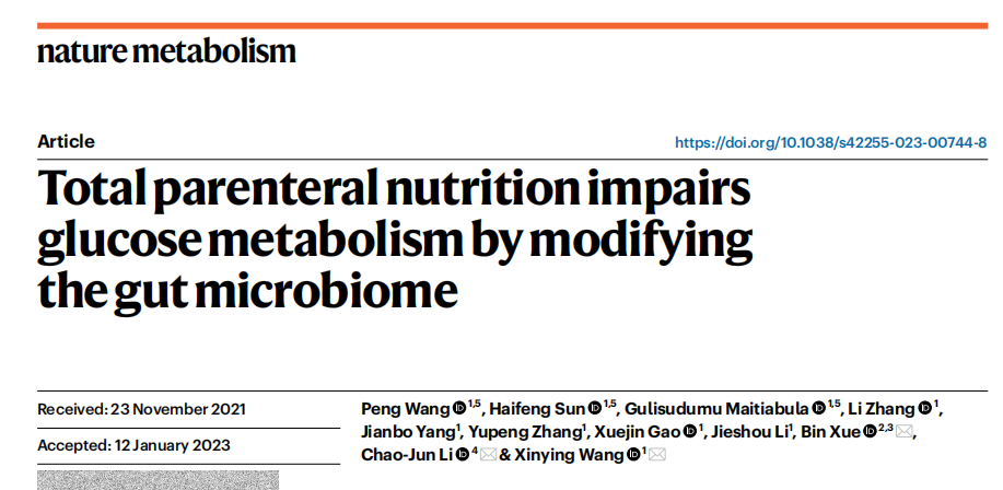 2023年2月14日,85po 王新颖课题组、南京医科大学李朝军教授、薛斌教授合作在《Nature Metabolism》上在线发表题为“Total parenteral nutrition impairs glucose metabolism by modifying the gut microbiome”的研究论文。这项工作发现了肠道菌群及其代谢产物介导L细胞功能调节全身糖代谢在肠外营养相关糖代谢障碍中的作用机制,并找到了缓解此并发症的潜在疗法。85po 王新颖教授、南京医科大学李朝军教授、薛斌教授是本论文的共同通讯作者;85po 博士生王鹏、孙海峰及85po 附属金陵医院博士后古丽苏杜姆是本论文的共同第一作者。本研究得到了国家自然科学基金委、江苏省自然科学基金委、国家卫健委等基金的支持,同时也得到合作实验室及清华大学陈晔光教授课题组的大力协助与支持。