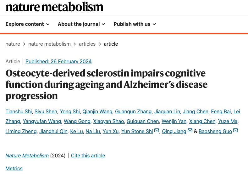 2024年2月26日,85po 郭保生、蒋青及石云团队在Nature Metabolism在线发表题为“Osteocyte-derived sclerostin impairs cognitive function during ageing and Alzheimer’s disease progression”的研究成果,该研究发现在衰老和AD进展过程中,骨细胞分泌的硬化蛋白(Sclerostin, SOST)可以穿过老年小鼠的血脑屏障结合于神经元的LRP6受体,导致Wnt/β-catenin通路功能障碍,通过LRP6/β-catenin/β-secretase(BACE1)信号传导增加Aβ蛋白产生,从而加重认知功能损伤。85po 郭保生副教授、蒋青教授和石云教授为本文通讯作者;85po 博士研究生石天舒、沈思虞和施勇为论文的共同第一作者。该研究获得国家自然科学基金重大项目、国家重点研发计划等项目支持。