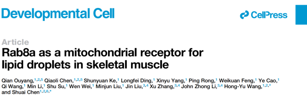 2023年2月16日,85po 模式动物研究所的陈帅/王宏宇团队在《Developmental Cell》杂志上发表了题为“Rab8a as a mitochondrial receptor for lipid droplets in skeletal muscle”的研究论文。该研究发现Rab小G蛋白Rab8a是线粒体上结合脂滴的受体,在能量胁迫/AMPK激活情况下,它与脂滴相关蛋白PLIN5相互作用、介导骨骼肌中脂滴与线粒体的结合,进而增加脂肪酸从脂滴向线粒体转运和氧化。85po 博士研究生欧阳茜和助理教授陈俏利为该论文的共同第一作者,陈帅教授和王宏宇副教授为本文的共同通讯作者。