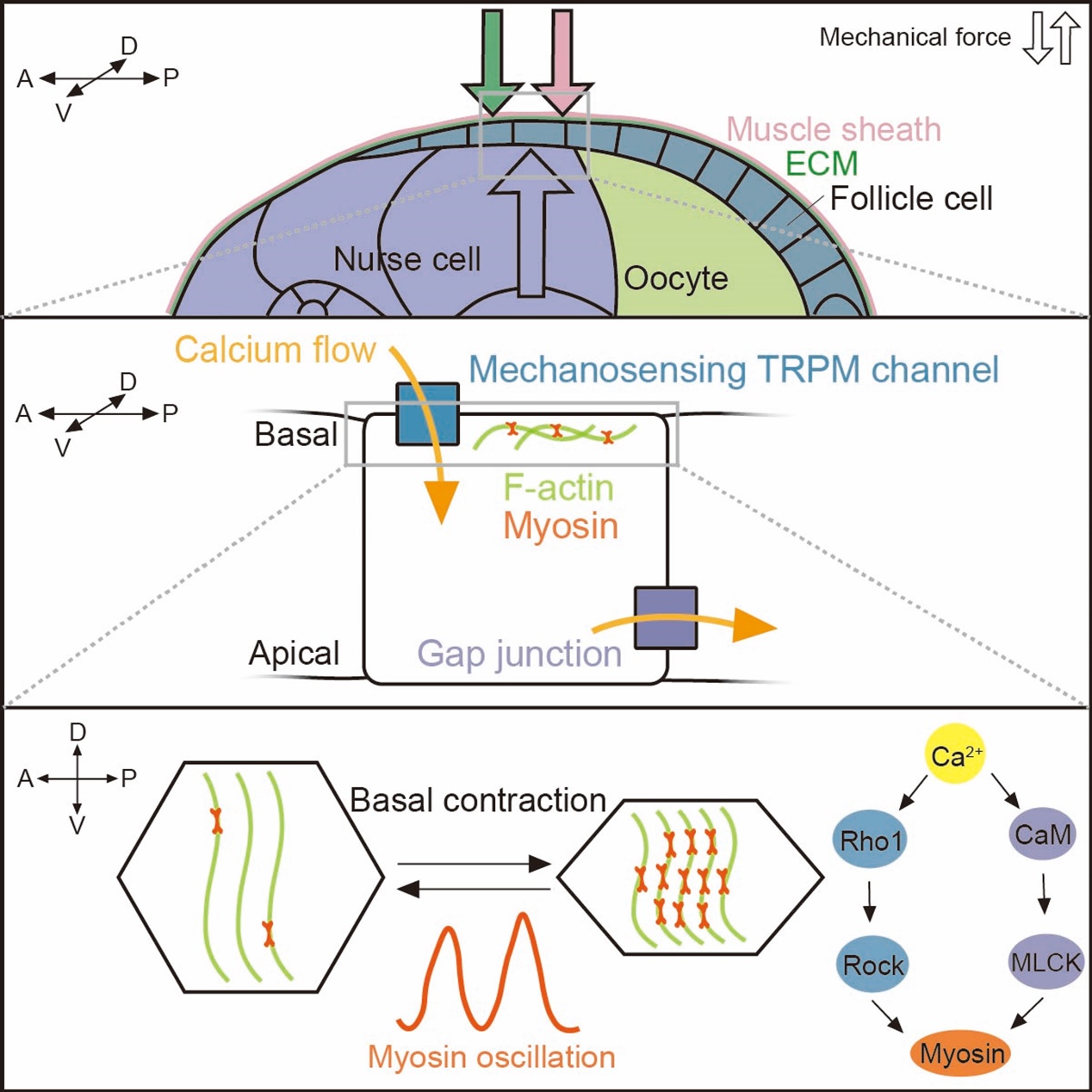研究发现,在果蝇卵巢发育的特定阶段(第9期),快速生长的生殖系细胞会对外层体细胞系的上皮卵泡细胞产生显著的机械压力。这种“来自内部的压力”并非被动存在,而是作为一种发育信号,被体细胞中特异表达的机械敏感钙通道TRPM感知。TRPM通道的激活引发钙离子内流,并通过CaM-MLCK和Rho1-Rok两条信号通路协同调控肌球蛋白II的周期性装配与解离(myosin oscillation),从而驱动卵室沿前-后轴方向的定向延伸。