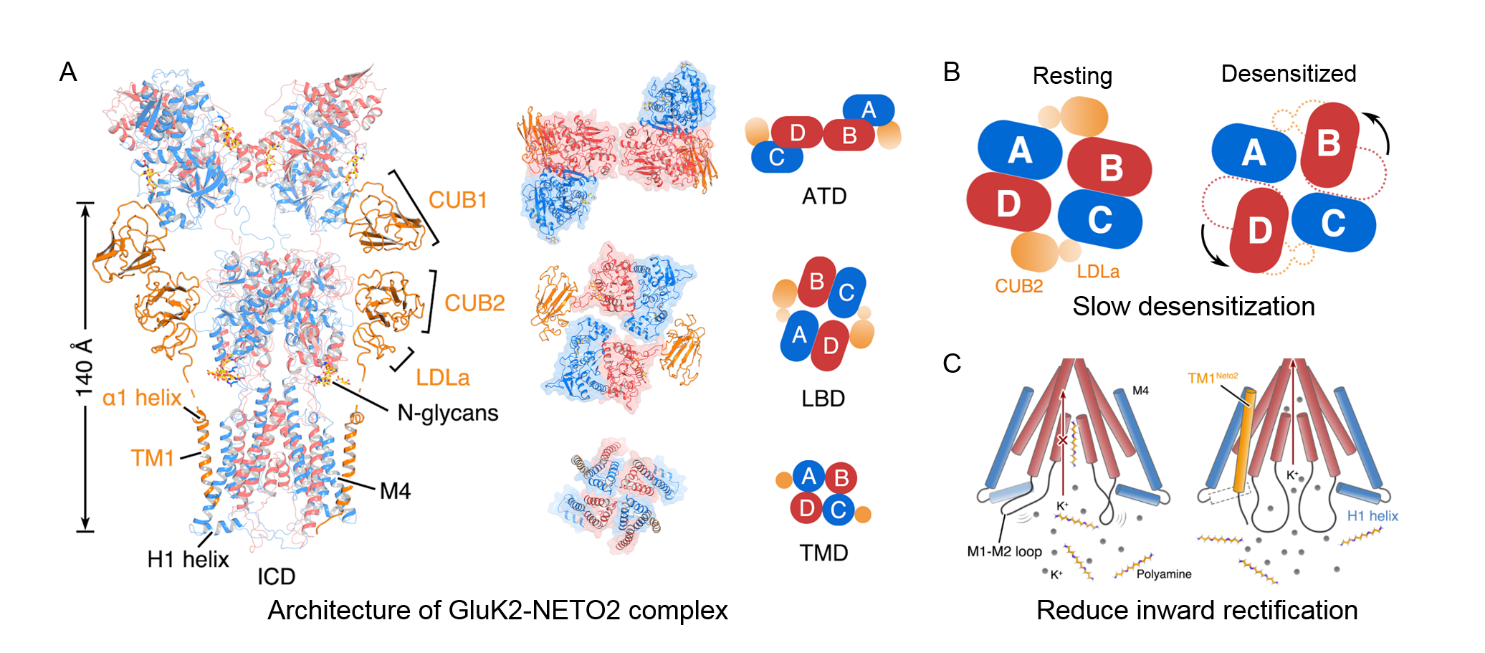 Kanaite受体GluK2形成四聚体的通道结构,包括氨基末端结构域(ATD)、配体结合结构域(LBD)和跨膜结构域(TMD)。复合物结构显示NETO2以化学计量比1:42:4结合在GluK2四聚体的一侧或者两侧。辅助亚基NETO2具有可溶的CUB1CUB2LDLa结构域以及一个跨膜螺旋TM1,分别与受体的ATDLBDTMD相互作用。电生理实验表明,任意一处相互作用位置的突变都会影响NETO2调控受体的活性。尤其是破坏ATD-CUB1的相互作用,NETO2将彻底失去调控受体活性的功能,这对于理解AMPA受体和Kainate受体中ATD结构域的功能提供了新的启示(图1A-B