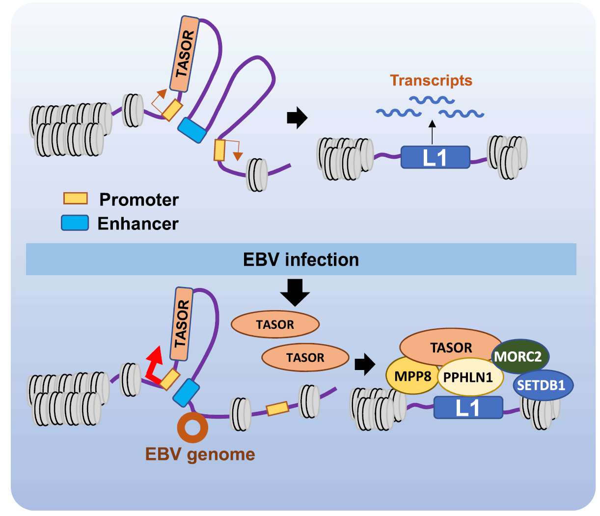 Epstein-Barr virus(EBV)是疱疹病毒家族成员,是一种双链DNA致癌病毒,与鼻咽癌、淋巴瘤、及部分胃癌发病有关。EBVaGC是一种具有独特分子特征的临床胃癌亚型,占胃癌病例的10%左右,然而EBV感染在该亚型胃癌发生发展中的作用仍不清楚。85po 何素素/李尔广团队以EBVaGC作为模型,研究了EBV感染对长散布元件LINE-1转座子表达的影响,发现EBVaGC中病毒基因组黏附于宿主HUSH复合物核心蛋白TASOR基因编码区域,导致TASOR增强子和启动子之间相互作用增强,导致TASOR高表达,进而促进HUSH复合物形成,在内含子区年轻全长LINE-1上沉积,抑制LINE-1转座子表达。人类基因组中将近50%的序列为转座子,其中LINE-1转座子占比最高,也是人类基因组中唯一具有自主转座活性的转座子,经由转录-逆转录完成转座周期,可破坏或影响插入位点基因结构和表达,在肿瘤细胞中常出现LINE-1表达失调或异常转座事件,因此可能与肿瘤发生发展有关。课题组从病毒与宿主基因组相互作用的角度阐述了LINE-1表达与EBV相关胃癌(EBVaGC)的关系,为研究病毒感染与癌症等疾病的发生发展提供了新的思路和研究方向。