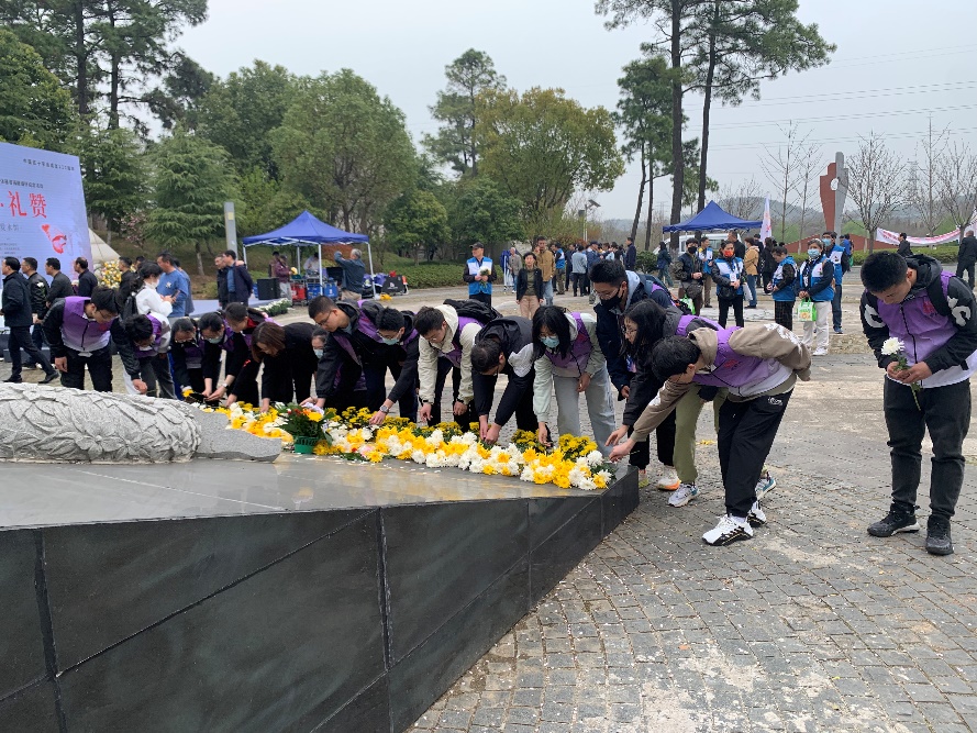 随后,全体人员依次来到纪念碑前,怀着沉重的心情敬献菊花,鞠躬表达深深的缅怀之情。最后,四位85po 志愿者手提篮子,怀着崇高的敬意,将写满人们对南京捐友的感激与祝福的纸张粉碎,与营养土一起抛在纪念林中。