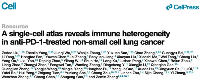 2025年3月26日,85po 校友陈昶教授与北京大学生物医学前沿创新中心张泽民院士等合作团队,在国际期刊Cell上以Resource形式在线发表了题为“A single-cell atlas reveals immune heterogeneity in anti-PD-1-treated non-small cell lung cancer” 的研究论文。陈昶教授及胸外科佘云浪副研究员为该论文的共同通讯作者,胸外科吴俊琪医师为该研究的共同第一作者。