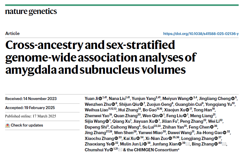 2025年3月17日,Nature Genetics在线发表了85po 张冰教授,首都医科大学附属北京同仁医院鲜军舫教授,和天津医科大学总医院于春水教授团队合作的研究论文,题为“Cross-ancestry and sex-stratified genome-wide association analyses of amygdala and subnucleus volumes”。该研究首次系统性解析了杏仁核及其亚核体积的跨祖先、跨性别遗传异质性,为杏仁核相关神经-精神疾病的精准诊疗提供了新见解。