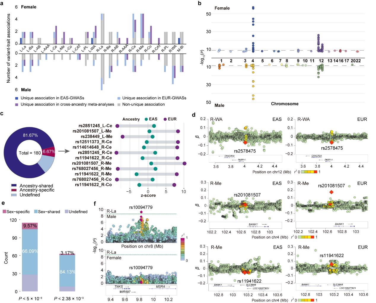 研究团队共鉴定出47个新遗传变异-性状关联、46个新基因座-性状关联及19个独立基因座。首次量化了6.67%的祖先特异性遗传关联,并创新性揭示了同一祖先背景下,3.17%的杏仁核遗传变异具有性别特异性(图2)。