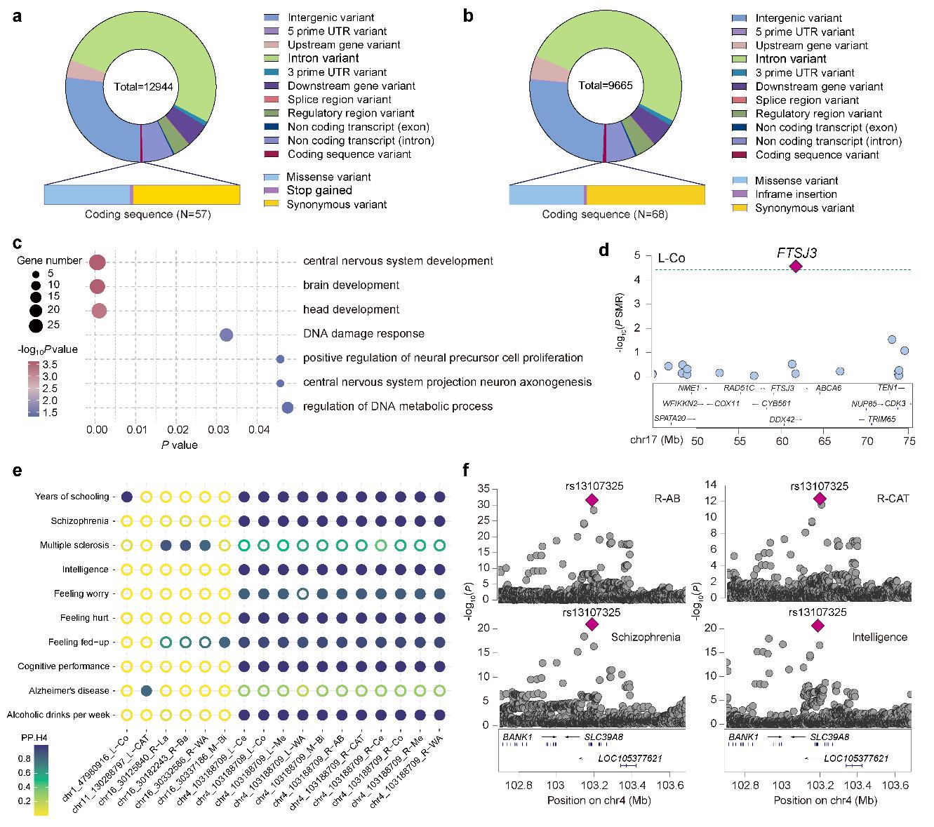 研究团队进一步通过精细映射与功能注释,锁定了16个因果遗传变异,并发现与杏仁核体积性状相关的基因在神经发育方面表现出显著富集。共定位分析表明,杏仁核体积有关的遗传变异与精神分裂症,多发性硬化和阿尔茨海默病等疾病存在遗传共定位(图3),为深入解析疾病分子机制及开发潜在治疗靶点提供了新方向。