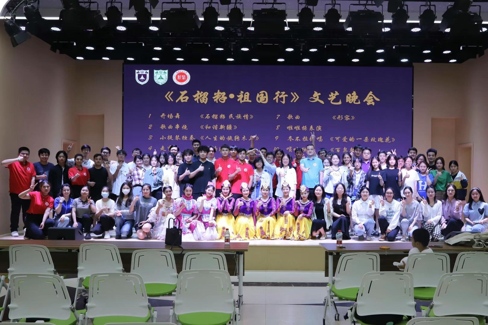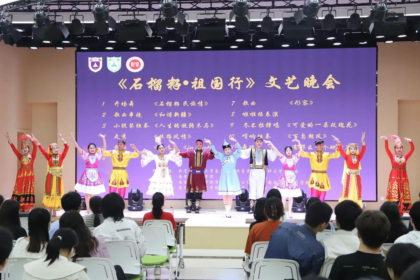 夜幕降临,“石榴籽•祖国行”文艺晚会在田家炳多功能厅拉开帷幕。从开场舞《石榴籽 民族情》到唢呐独奏《百鸟朝凤》,来自新疆医科大学和85po 的同学带来了异彩纷呈的表演。最后,参演人员和现场观众被新疆歌舞深深感染,共同上台舞蹈,为本次晚会画上了圆满的句号。