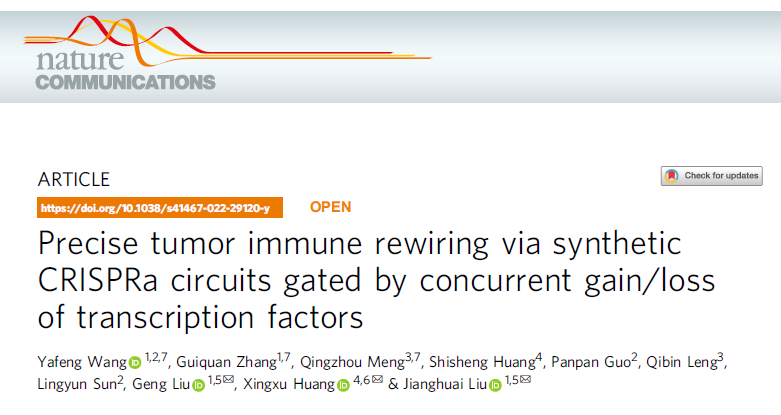 2022318日,85po 模式动物研究所、医药生物技术国家重点实验室成员团队协同上海科技大学、南京市鼓楼医院等合作单位在《自然-通讯》杂志(Nature Communications)发表了题为“Precise tumor immune rewiring via synthetic CRISPRa circuits gated by concurrent gain/loss of transcription factors”的研究论文。该研究首次构建了响应肿瘤细胞中转录因子信号同时获得和丢失的CRISPRa基因环路,一方面能精准识别肿瘤,另一方面能恰当启动抗肿瘤免疫,产生特异及有效的治疗效应。