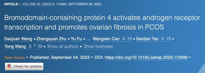 2023年9月4日,85po 王勇教授、曹望森教授团队在Cell Reports杂志发表了题为“Bromodomain-containing protein 4 activates androgen receptor transcription and promotes ovarian fibrosis in PCOS”的论文,该研究揭示了乙酰化“阅读”蛋白BRD4促进AR转录活化是PCOS卵巢纤维化的重要表观遗传学旁路。85po 王勇教授、曹望森教授和附属鼓楼医院陶高见主任为本论文的共同通讯作者,85po 博士研究生王道娟为本论文的第一作者。本研究得到了国家自然科学基金(#82201795,81971346)的资助。王道娟博士为本研究的第一作者。