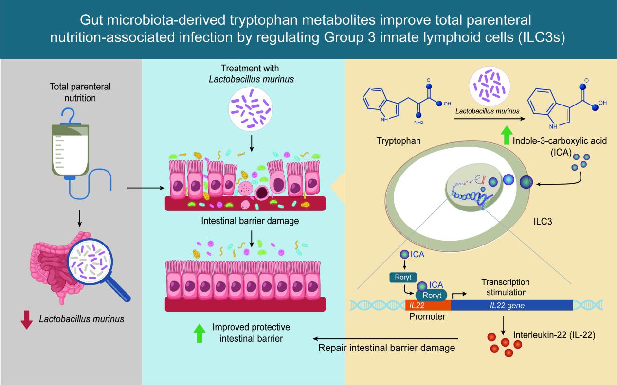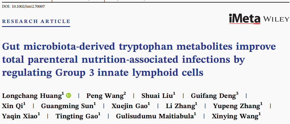 2025年2月26日,85po 附属金陵医院王新颖课题组在iMeta在线发表了题为“Gut microbiota-derived tryptophan metabolites improve total parenteral nutrition-associated infections by regulating Group 3 innate lymphoid cells”的研究成果。这项研究阐明了TPN过程中的“微生物-代谢-免疫”的调控机制,证明了靶向肠道微生物及肠道免疫稳态治疗IF、实现真正的“人工胃肠”是有希望的,为扭转“肠衰竭”不良结局和促进IF病人的肠康复治疗提供了重要的理论基础。85po 博士生黄龙昌、王鹏、刘帅和华中科技大学协和深圳医院邓桂芳为本文的共同第一作者。85po 附属金陵医院王新颖教授为本文的通讯作者。该项研究得到了国家自然科学基金委、科技部、江苏省科技厅以及中央高校等基金的支持,并在相关研究方面得到合作实验室的大力协助与支持。