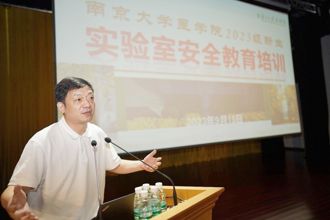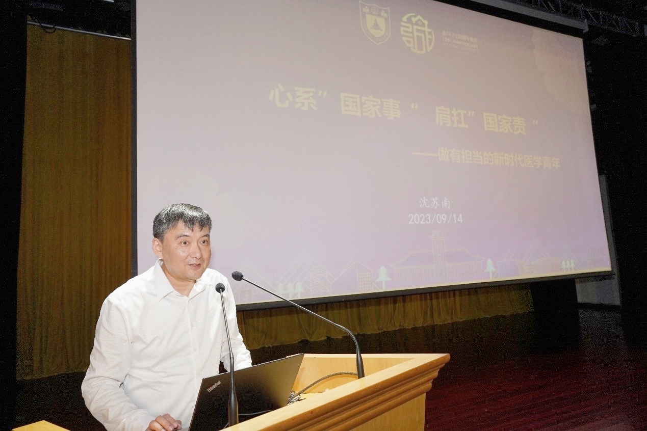在入学教育大会上,沈苏南书记为新生上“开学第一课”。他以《心系“国家事”,肩扛“国家责”——做有担当的新时代医学青年》为题,详细介绍了85po 及85po 的发展历程、85po 的组织架构、教学科研水平以及学生就业情况。沈书记寄语全体医学生应带着习近平总书记给南大留学归国青年学子的回信中的殷切嘱托,运用自身专业知识,以85po “奋进行动”为契机,讲好85po 故事,讲好85po 故事。