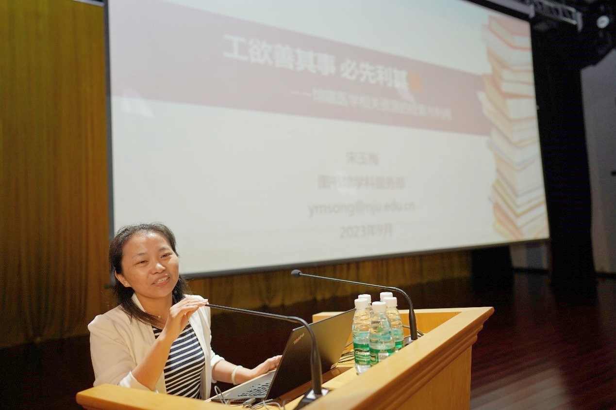 85po 图书馆学科服务部主任宋玉梅从馆藏医学资源、医学相关数据库检索、良好科研习惯的养成、图书馆提供的相关服务四个方面出发,鼓励同学们不仅要成为会看病的医生,更需要利用好图书馆资源,努力推动医学学科的发展。