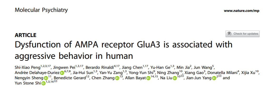 2022年6月13日,85po 模式动物研究所石云团队在Nature 子刊,精神病学领域旗舰学术期刊《分子精神病学》(Molecular Psychiatry)在线发表了题为《Dysfunction of AMPA receptor GluA3 is associated with aggressive behavior in human》的研究论文,85po 博士生彭世笑、裴静文、意大利Maggiore公立医院的Berardo Rinaldi和85po 附属鼓楼医院博士后陈江为本文的共同第一作者(彭世笑博士毕业后为郑州大学一附院助理研究员)。85po 石云教授、郑州大学附属第一医院杨建军教授和南京医科大学附属脑科医院柳娜副教授为该文的通讯作者。另有10多位国内外研究人员参与本工作。该研究工作受到国家自然科学基金,科技部重大专项项目和江苏省自然基金等基金的支持。