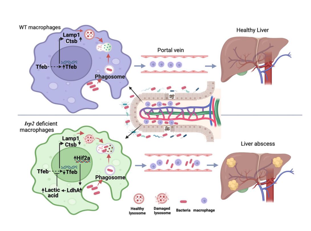 85po 85po 李宽钰教授课题组和附属鼓楼医院病理科樊智文副研究员合作,利用葡聚糖硫酸钠盐(DSS)造肠炎模型后,意外发现Irp2缺失小鼠有肝脓肿表型。为了探究IRP2在保护机体免受肠源性感染造成肝脓肿中的作用及其机制,研究人员首先给予Irp2全身敲除和髓系细胞Irp2敲除小鼠间隔DSS饮水构建肠道屏障损伤后,发现Irp2缺失后不影响中性粒细胞载菌量变化,只增加巨噬细胞载菌量,同时发现Irp2缺失并不影响巨噬细胞的吞噬功能和溶酶体递送功能,但显著影响溶酶体的生物合成和酸化能力。进一步机制研究发现Irp2缺失上调Hif2a表达,引起乳酸脱氢酶的活性和乳酸水平增加,促进转录因子TFEB的磷酸化,导致TFEB不能正常入核,溶酶体生物合成减少,酸化能力下降,降低了巨噬细胞清除细菌的能力。因此,Irp2缺失后,病原菌有机会从受损的肠屏障进入门静脉,不断侵袭和易位进入肝脏,促进肝脓肿的发生发展。