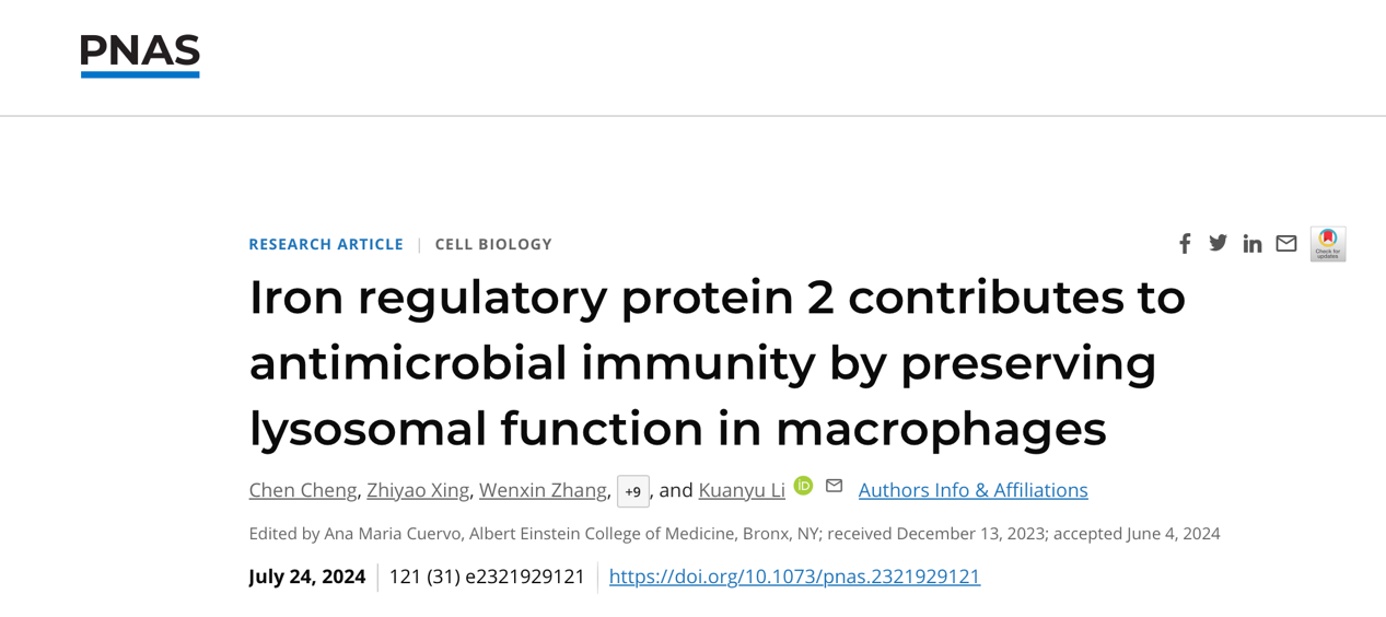 2024年7月24日,李宽钰课题组在PNAS杂志发表了题为“Iron regulatory protein 2 contributes to antimicrobial immunity by preserving lysosomal function in macrophages”的研究论文。该研究开拓了IRP2的功能,阐明了IRP2对免疫细胞功能的影响,为临床治疗肠源性肝脓肿提供新的靶点。85po 李宽钰教授和85po 附属鼓楼医院樊智文副研究员为论文通讯作者,85po 博士生程晨为本文的第一作者。本研究得到了以色列理工大学Esther Meyron-Holtz教授,墨西哥Cinvestav的Fanis Missirlis教授的帮助;得到了85po 附属金陵医院普外科的李毅教授、附属鼓楼医院血管外科的乔彤教授和河北师范大学常彦忠教授等的大力帮助;得到了国家自然科学基金(#32271221, #82170592)的资助。