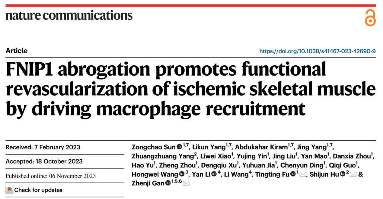 2023年11月6日,85po 甘振继教授课题组联合苏州大学胡士军教授课题组在Nature Communications长文发表了题为“FNIP1 abrogation promotes functional revascularization of ischemic skeletal muscle by driving macrophage recruitment”的研究成果。85po 博士研究生孙宗超、杨立坤、阿布都哈卡尔·克拉木、杨静为本文的共同第一作者。85po 甘振继教授、苏州大学胡士军教授及85po 付婷婷副研究员为本文的共同通讯作者。共同作者里还有85po 的王宏伟教授,江南大学的李言教授和王立教授等。研究得到合作实验室的大力协助与支持。上述研究得到了中国科学技术部、国家自然科学基金委、教育部、江苏省科技厅以及中央高校等基金的支持。
