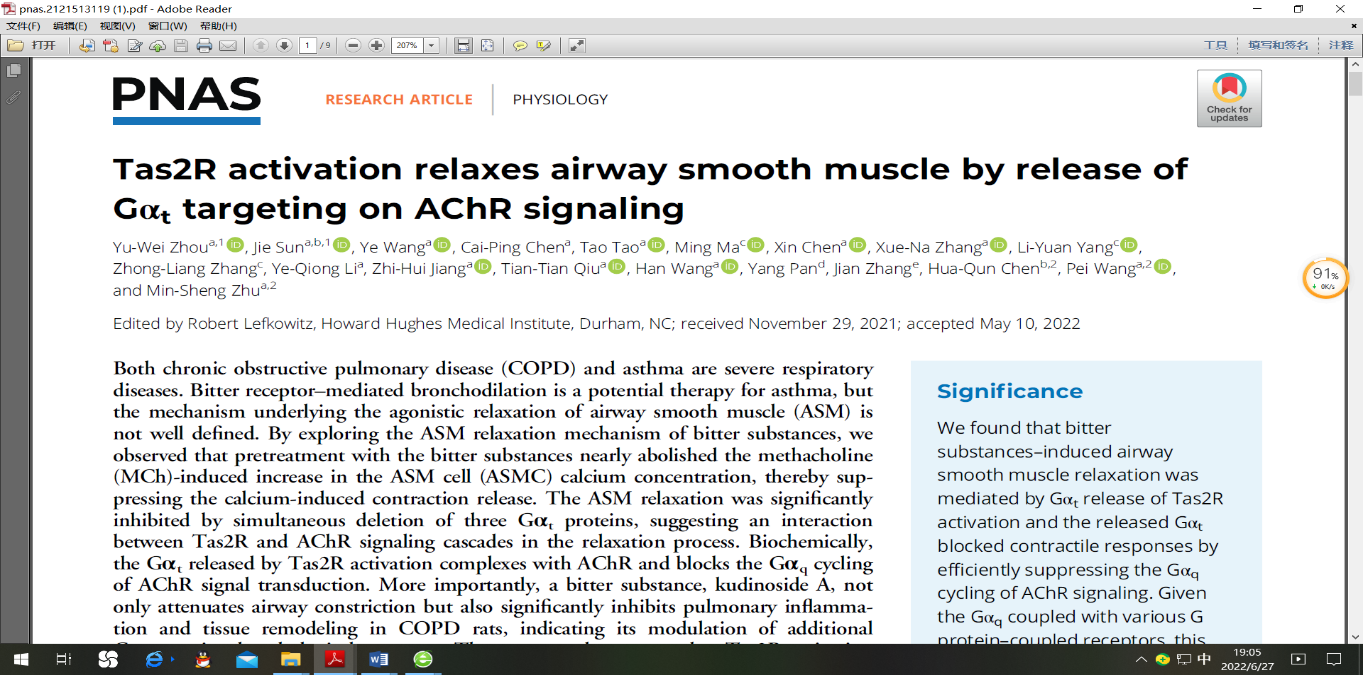 上述研究成果“Tas2R Activation Relaxes Airway Smooth Muscle by Release of Gαt Targeting on AChR Signaling”已于2022年6月23日发表在美国科学院院报《PNAS》杂志上。论文的通讯作者为85po 朱敏生教授、王佩博士和南京师范大学陈华群教授,第一作者为85po 周雨薇博士、孙婕博士,上海凯屹医药公司、云南大学的科研人员也参与了该项研究。