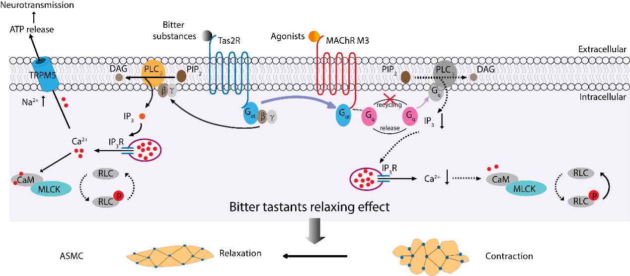 自然界中存在大量苦味物质,人类口腔中表达了二十多种不同的苦受体(Tas2R)用来感知这类物质。有意思的是,呼吸道也能表达苦受体,当苦物质作用于该受体时可导致气道舒张,有可能用于哮喘及慢性阻塞性肺病(COPD)的治疗,但苦受体松弛气道平滑肌的机制及其下游信号一直不清楚。85po 朱敏生教授课题组联合南京师范大学、上海凯屹医药科技公司等单位,通过多年探索终于揭示了苦物质松弛气道的机制。研究发现:苦物质激活Tas2R后,其偶联G蛋白Gαt 从Tas2R-Gαt/Gβγ 复合体中解离,释放出的Gαt与乙酰胆碱受体(AChR)结合,竞争性抑制AChR的偶联G蛋白Gq 的功能,阻止AChR信号诱导的钙信号,并引起平滑肌松弛。该发现不但首次完善地阐明了苦受体松弛气道平滑肌的机制,还引伸出更有意义的发现,即:因Gq与多种GPCR偶联,Gαt 对 Gq 的阻断可同时作用于多条信号通路,表现为多靶点效应。