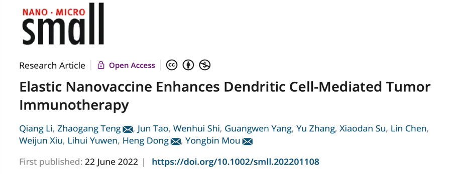 上述研究成果“Elastic Nanovaccine Enhances Dendritic Cell-Mediated Tumor Immunotherapy”已于2022年6月22日在线发表于国际知名期刊《Small》,并被遴选为《Small》该期封底内页(Inside Back Cover)论文。论文通讯作者为85po 附属口腔医院牟永斌教授、南京邮电大学滕兆刚教授以及85po 附属口腔医院董衡医生,第一作者为85po 博士研究生李强。该研究受到国家自然科学基金面上项目、江苏省重点研发计划(社会发展)项目、江苏省自然科学基金、南京市卫生科技发展专项资金项目计划等基金资助。