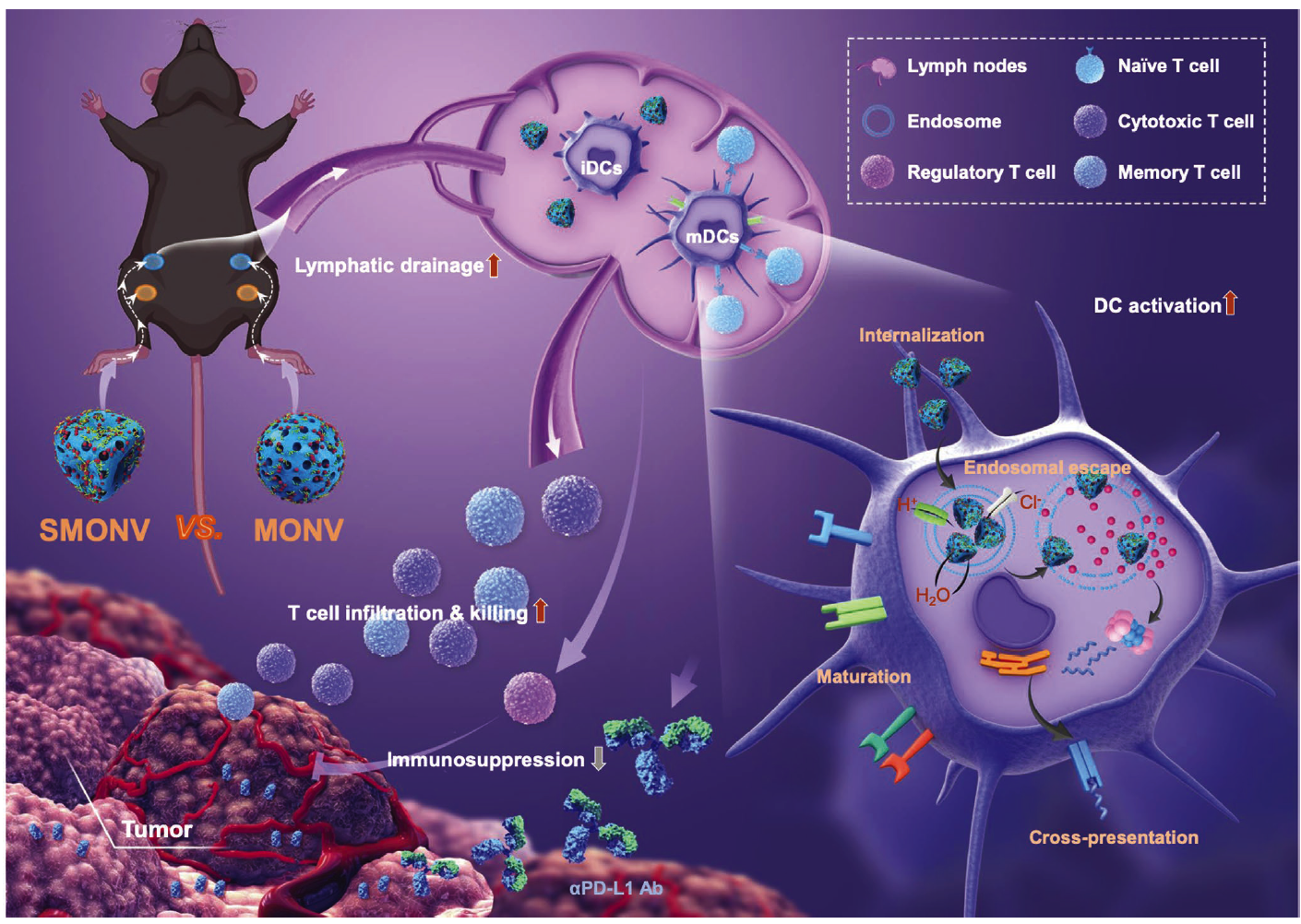 85po 附属口腔医院牟永斌教授团队与南京邮电大学滕兆刚教授团队合作,制备了一种柔性介孔有机硅基纳米疫苗(SMONV),并研究了该纳米疫苗机械性能对DC介导免疫应答的影响及相关机制。 研究发现,SMONV因其柔性可促进DC对抗原蛋白更多的摄取,通过内体逃逸诱导大量抗原的胞质递送,引起DC有效成熟和抗原交叉提呈。 此外,柔软特性使SMONV提升了体内抗原的淋巴引流效率,激活了高效的体液和细胞免疫。荷瘤小鼠纳米疫苗接种的结果进一步表明,皮下注射SMONV可高效诱导抗原特异性CD8+ T细胞免疫响应,改善调节性T细胞介导的免疫抑制,增强记忆T细胞介导的免疫记忆,有效抑制荷瘤小鼠的肿瘤生长。 此外,SMONV和抗PD- L1抗体联合应用可进一步增强其抗肿瘤效果。