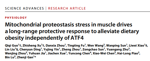 2022年7月27日,85po 甘振继课题组在Science Advances上在线发表了题为“Mitochondrial proteostasis stress in muscle drives a long-range protective response to alleviate dietary obesity independently of ATF4”的最新研究成果。这项研究定义了骨骼肌线粒体UPRmt,揭示了UPRmt在哺乳动物体内的新生理功能和作用机制,阐明了骨骼肌线粒体UPRmt 通过ATF4非依赖的机制长距离调节肝脏和脂肪代谢决定整体代谢健康。85po 博士研究生郭奇奇和徐志圣为本文的共同第一作者,甘振继教授为该篇论文的通讯作者。该研究得到了国家自然科学基金委、科技部、教育部、江苏省科技厅以及中央高校等基金的支持,同时也得到合作实验室的大力协助与支持。