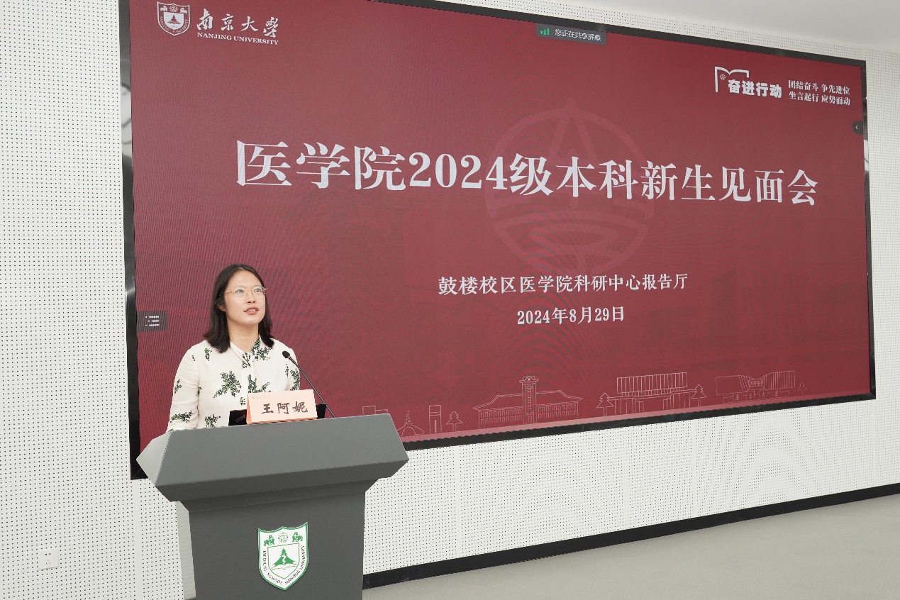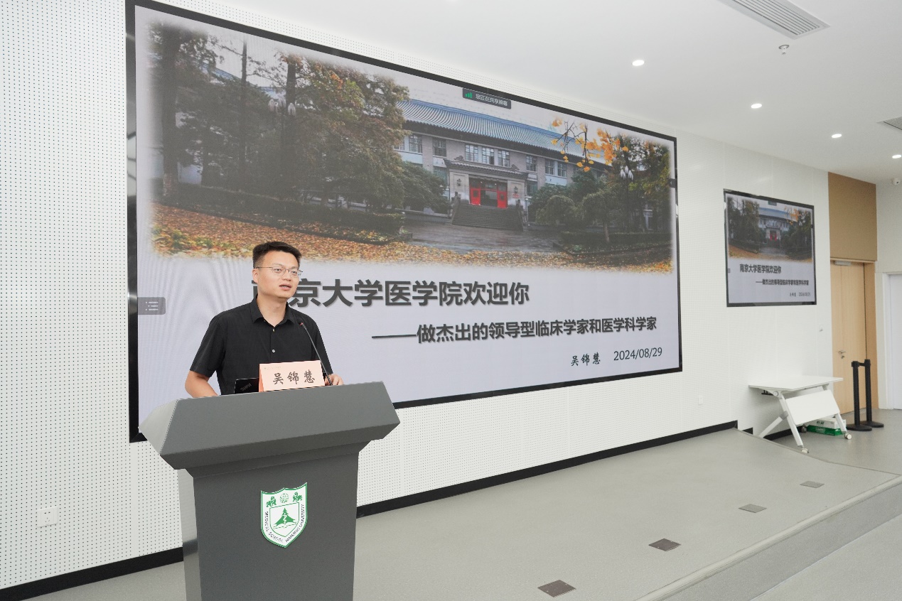 王阿妮首先向新生表示热烈欢迎,并从性别比例、专业分布和生源地等方面介绍了2024级医学专业新生概况。吴锦慧以“85po 欢迎你——做杰出的领导型临床学家和医学科学家”为题,向新生及家长详细介绍了南大85po 的历史沿革、发展现况及培养目标。