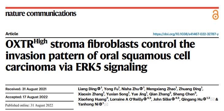 2022年8月31日,85po 附属口腔医院泥艳红、胡勤刚团队在口腔鳞癌(OSCC)复发的机制方面取得重要进展,发现了一种新的调控肿瘤浸润方式的成纤维细胞亚群,并提出了通过靶向此亚群来改变肿瘤浸润方式的策略,为减少肿瘤患者转移和复发肿瘤提供了新的治疗思路。该研究成果“OXTRHigh stroma fibroblasts control the Invasion Pattern of Oral Squamous Cell Carcinoma via ERK5 Signaling”以研究长文形式在线发表于《Nature Communications》。85po 附属口腔医院丁亮副研究员为文章第一作者,85po 附属口腔医院中心实验室泥艳红主任和胡勤刚教授为文章通讯作者。该项研究工作得到85po 附属口腔医院口腔颌面外科、病理科、检验科、口腔疾病生物样本库的大力支持,同时得到中国博士后基金、国家自然科学青年基金、江苏省自然科学基金、省部共建临床医学中心等项目的资助。