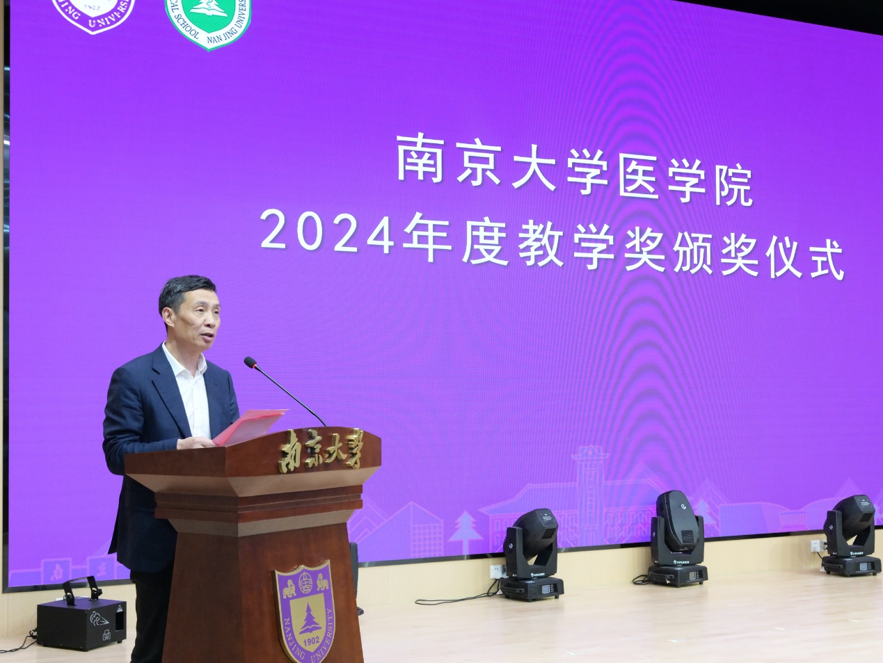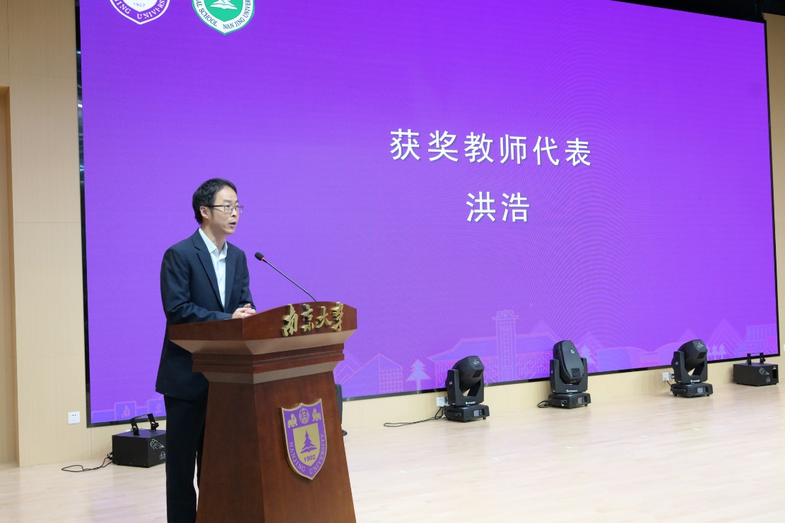 获奖教师代表洪浩发言。他指出,在医学快速发展的时代,作为教师要牢记育人初心,不断提升教学质量,加强科研创新能力,帮助学生打牢专业基础,拓展学科知识,培养更多具有国际视野、创新精神和社会责任感的杰出医学人才。